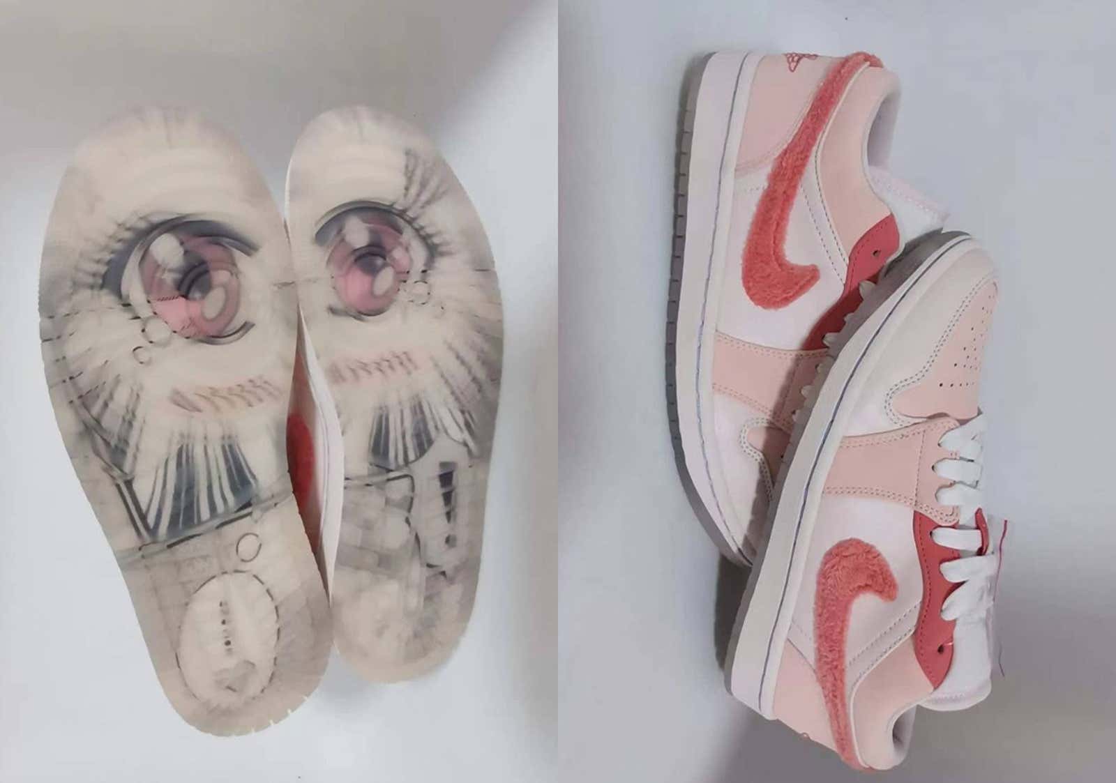 Air Jordan 1 Low. Ayakkabının üzerinde bazı yumuşak detaylarla birlikte pembe tonları bulunuyor. Ayakkabının tabanında ise, yine bir anime karakterinin gözleri bulunuyor.