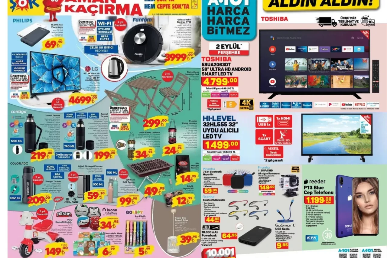 1 Eylül'de ŞOK market zincirleri aktüel teknolojik ürünleri arasında LG akllı televizyon var. 2 Eylül'de A101'de ise yine Toshiba marka televizyon ve akıllı telefon yer alıyor. Ayrıca Piranha marka ürünler de marketlerde yerini alacak.