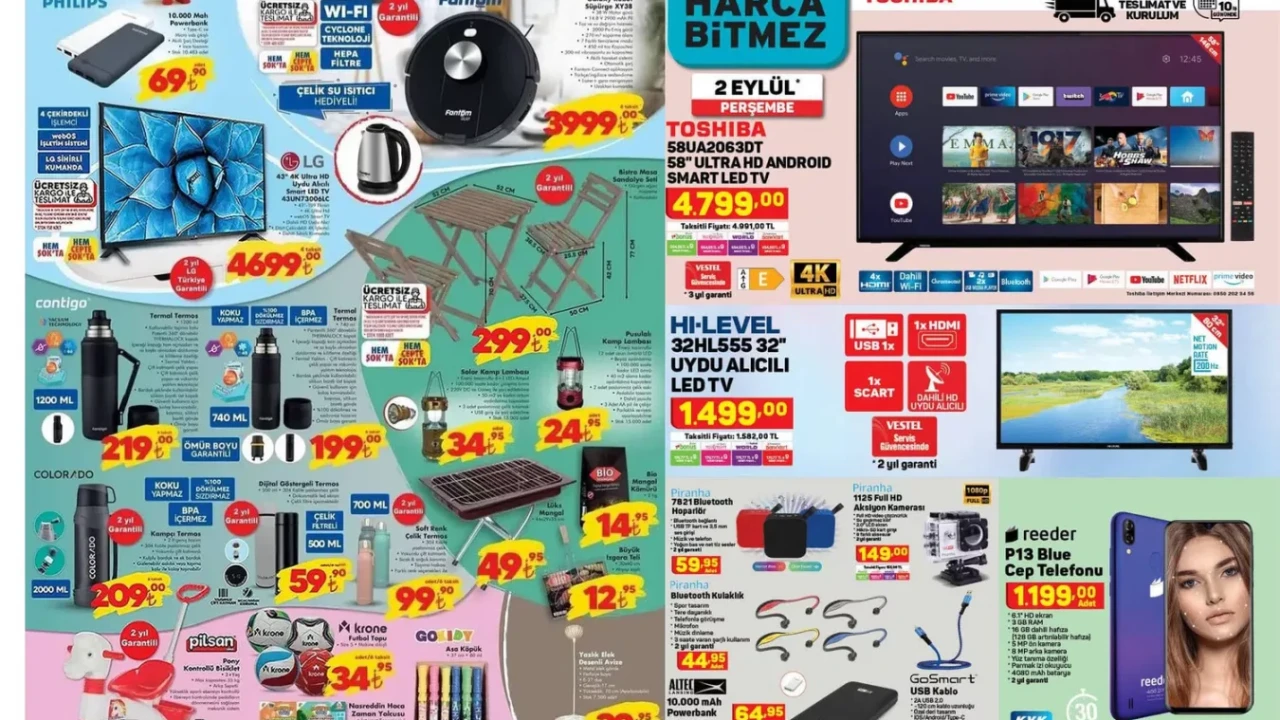 Toshiba 85UA2063DT 58 inç Ultra HD Android Smart LED TV - 4799 TLHI-LEVEL 32HL555 32 inç Uydu alıcılı LED TV - 1499 TLPiranha aksiyon kamerası - 149 TLReeder P13 Blue akıllı telefon - 1199 TL