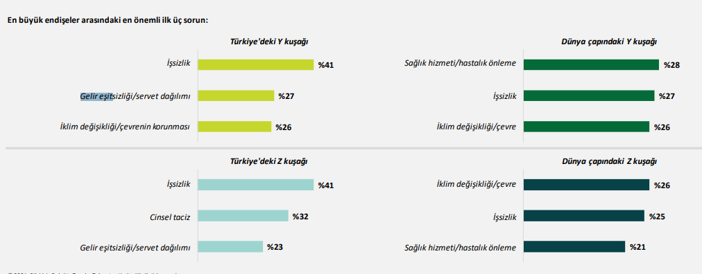 işsizlik. "2021 Y ve Z Kuşağı Araştırması” bağlamında Z kuşağının en büyük ikinci endişe kaynağı ise