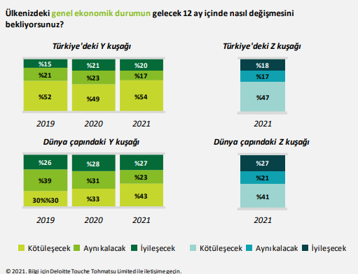 Araştırmada çıkan sonuca göre Türkiye'deki gençlerin ekonomik ve politik konularda gelecek kaygısı çok yüksek. “Ülkenizdeki genel ekonomik durumun gelecek 12 ay içinde nasıl değişmesini bekliyorsunuz?” sorusuna Türkiye’de Y kuşağına ait gençler %54 ile “kötüleşecek”, %17 ile “aynı kalacak”, %20 ile “iyileşecek” yanıtını vermekte. Bu oranlar Z kuşağında ise sırasıyla %47, %17 ve %18 olarak kaydedilmiş.