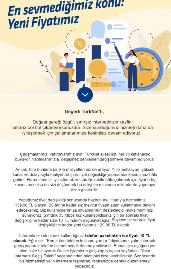 “Çalışmalarımız, yatırımlarımız aynı TurkNet ailesi gibi her yıl katlanarak büyüyor. Yaptıklarımızla, değişmez denilenleri değiştirmeye devam ediyoruz! Ancak, tüm bunlarla birlikte maliyetlerimiz de artıyor. Yıllık enflasyon, yüksek kurlar ve dolayısıyla maliyet artışları fiyat değişikliği yapmamızı kaçınılmaz hâle getirdi. Hizmetlerimizi iyileştirmek ve sürdürülebilir hâle getirmek için fiyat artışı kaçınılmaz olsa da sizi düşünerek bu artışı en minimum miktarlarda yapmaya özen gösterdik.”
