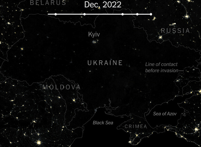 Savaş öncesi ve sonrası görüntülerin yer aldığı fotoğraflarda Ukrayna'nın başkenti Kiev gibi büyük şehirler yok olmaya başladı. Ayrıca Rusya'nın geçen sonbaharda yeni bir taarruza geçmesiyle başlayan altyapı saldırıları, Tüm ülkeyi neredeyse yaşam belirtilerinden alıkoydu.