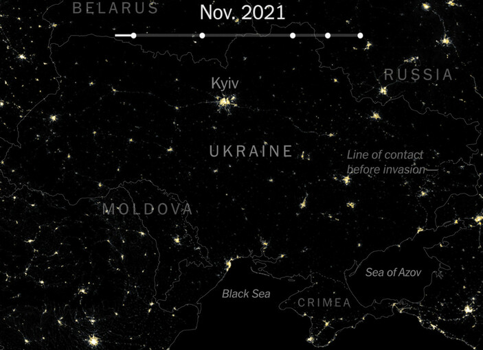 NASA tarafından kullanılan bir uydu savaş sonrası Ukrayna'yı görüntüledi. Savaş öncesi ve sonrası paylaşılan fotoğraflarda Ukrayna, resmen karanlığa gömüldü.