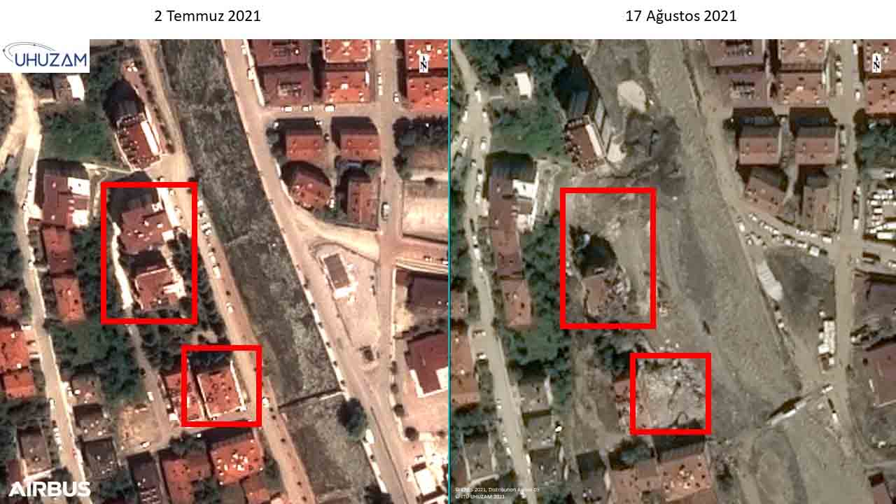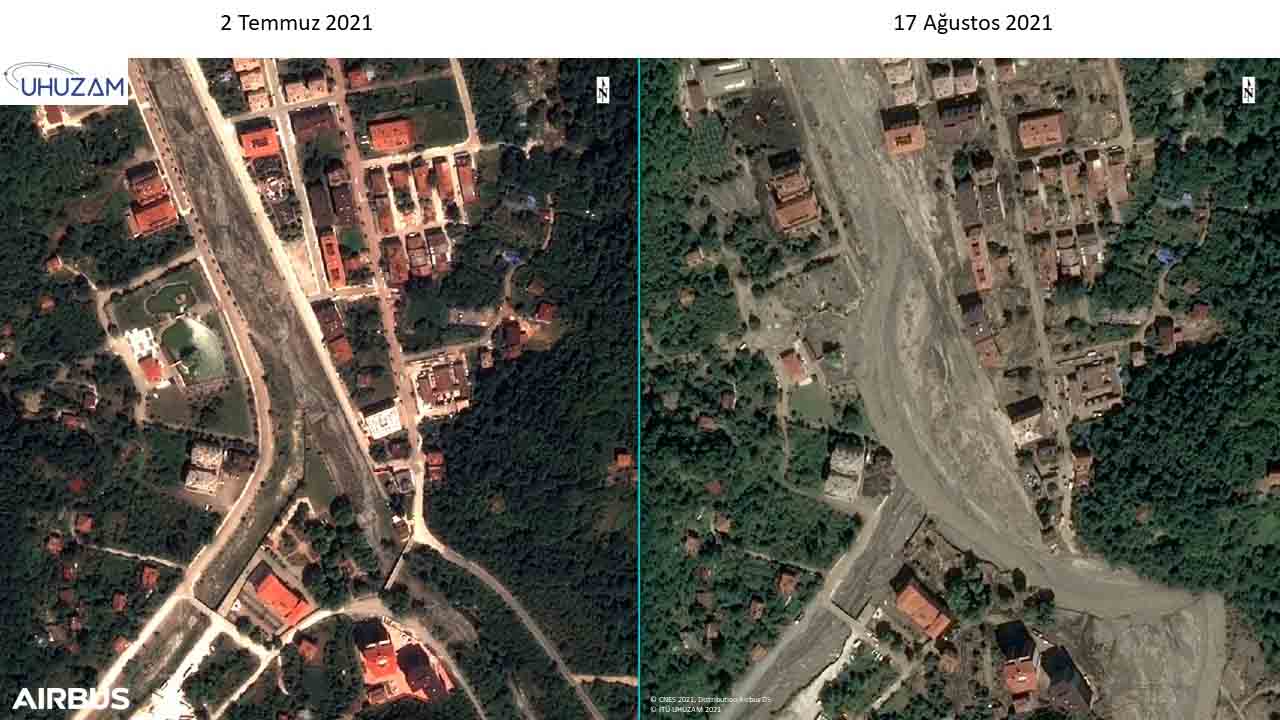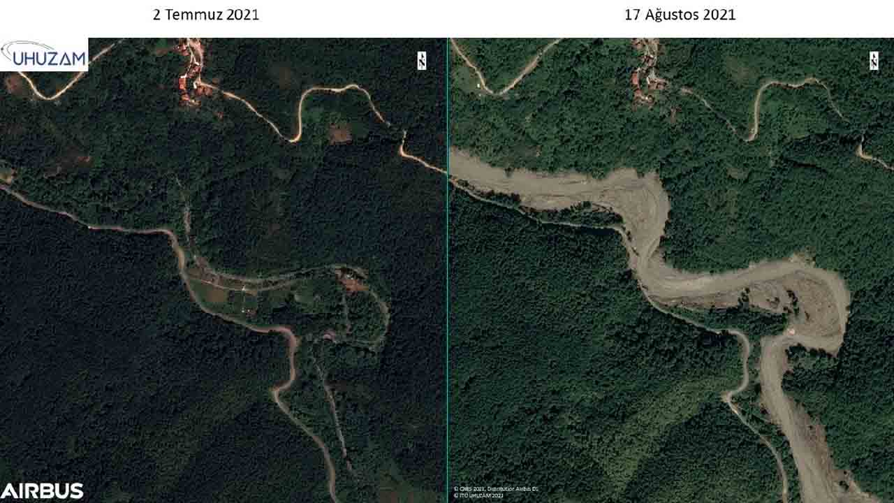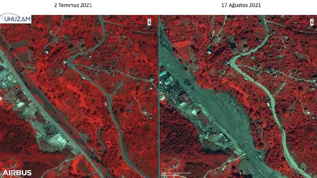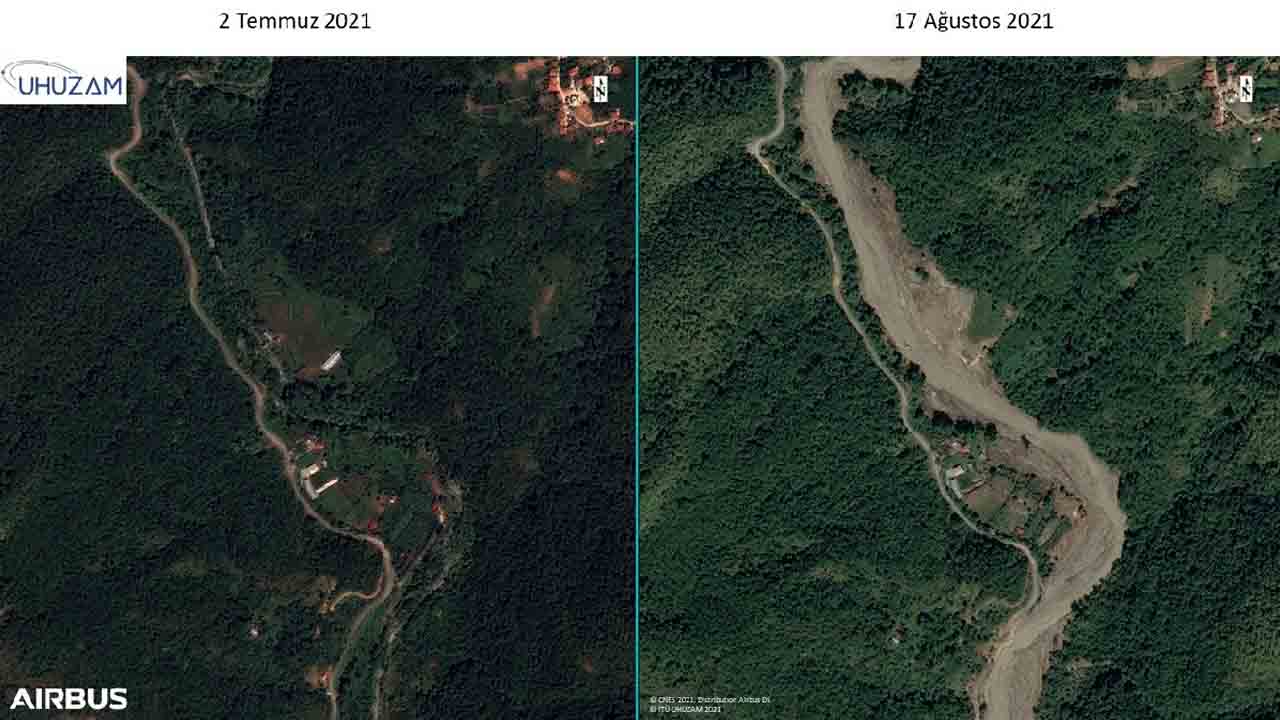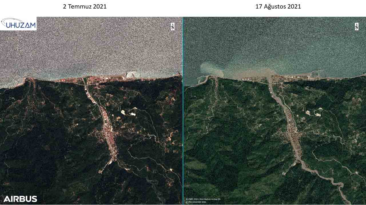 "Özellikle iklim değişikliği sebebiyle yağışın dağılışı farklılaştı. Özellikle Bozkurt ve Abana bölgesine 1 yılda yağacak yağışın yarısı 2-3 gün gibi kısa bir sürede yağdı. Böyle olunca ciddi mal ve can kayıpları yaşandı. Bu durumu uydu görüntülerinde çok net bir şekilde görmekteyiz." diyen Prof. Dr. Mustafa Yanalak, "Abana bölgesinde bir delta oluştuğunu görebiliyoruz. Yine bütün havza boyunca taşınabilen malzemelerin selle birlikte taşınıp yığıldığını görebiliyoruz. 30 metre genişliğinde olan dere yatağı sel sonrası 300- 350 metrelere kadar yayıldı. Yine burada birçok yıkılmış binalar ve köprüleri tespit ettik. Onun dışında yine belirgin bir şekilde yeşil alan ve futbol sahası gibi alanların tamamen kaybolduğunu ve sel altında kaldığını görebiliyoruz."