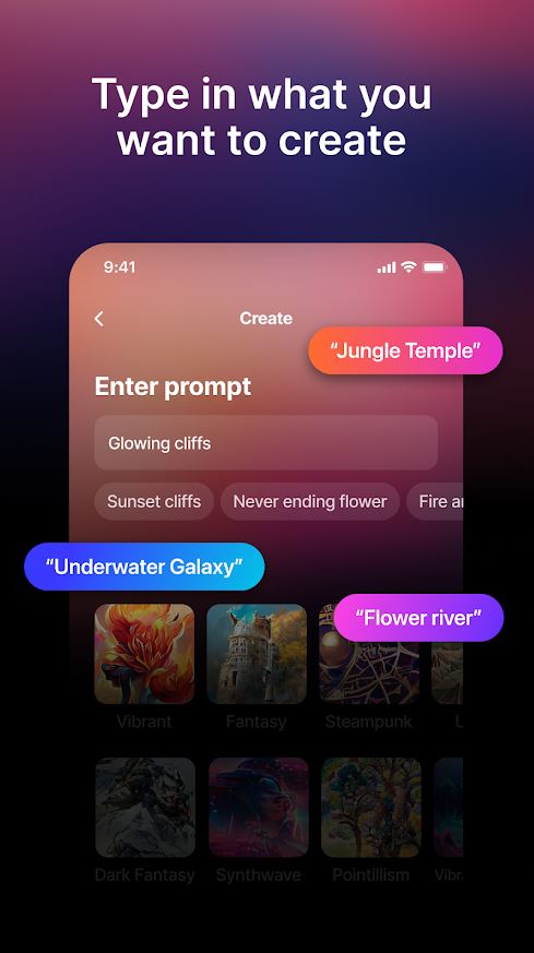 1- Uygulamayı iOS ya da Android cihazınıza indirin 2- 'Get Started' butonuna basın 3- 'Type Anything' (Bir şey yazın) kısmına gelin ve istediğiniz kelimeyi yazın. İngilizce olmasını öneriyoruz. 4- Daha sonra 'Choose art style' kısmından ortaya çıkarılacak sanat eseri tarzını seçin 5- 'Create' butonuna basın 6- Görsel karşınıza gelecektir. Sağ üstteki indir butonuyla görseli indirebilirsiniz. Android cihazınıza indirmek için buraya tıklayabilirsiniz. iOS cihazınıza indirmek için buraya tıklayabilirsiniz.