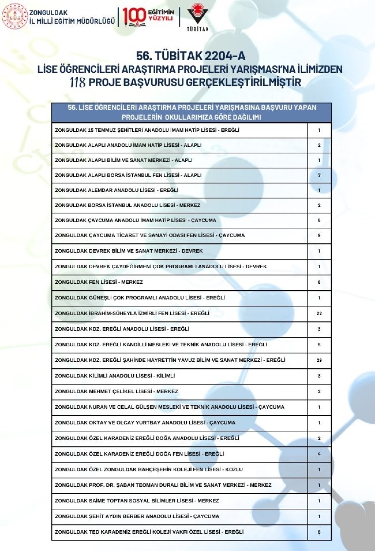 Zonguldak İl Millî Eğitim Müdürlüğü, 56. TÜBİTAK 2204-A Lise Öğrencileri Araştırma Projeleri Yarışması kapsamında il genelinde 118 projenin başvuru yaptığını duyurdu.